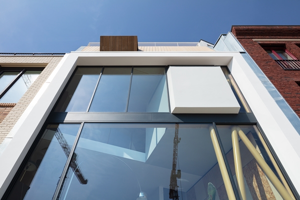 Op de begane grond bevindt zich de keuken, met ruim zicht naar zowel de straat- als tuinzijde. Aan de kant van de tuin is een beschut terras gerealiseerd. De woonruimte, die achter de glazen pui ligt, bestaat uit twee lagen met een flexibele tussenverdieping. Ook hier hebben de bewoners een ruim zicht op de voor- en achterkant van het huis. De nu aanwezige vides kunnen in de toekomst worden dichtgelegd, laat het architectenbureau weten.