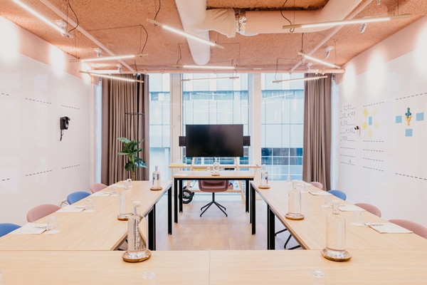 Een veertig meter lange rasterwand vormt de visuele ruggengraat en verbindt de verschillende ruimtes, zoals de trappen, liften, vergaderruimtes en ‘break-outs’ waar de gebruikers kunnen ontspannen. De muur is gemaakt van geluidabsorberend houtwolcement, een materiaal dat in de jaren zeventig in plafonds van menig studentenhuis werd gebruikt. Daarmee vormt het een knipoog naar de achtergrond van het hotel.