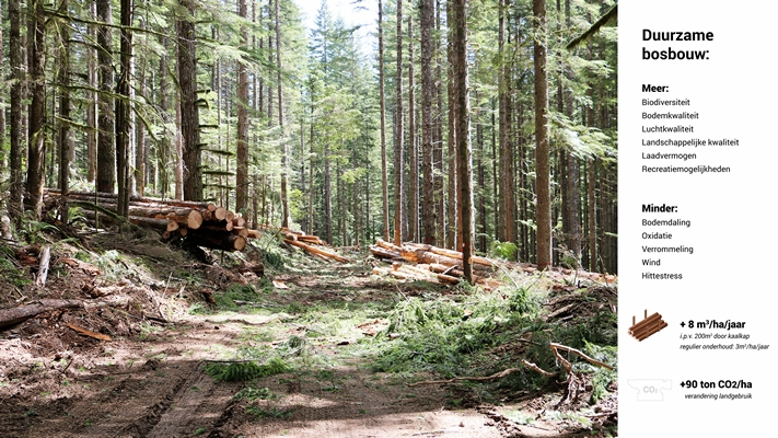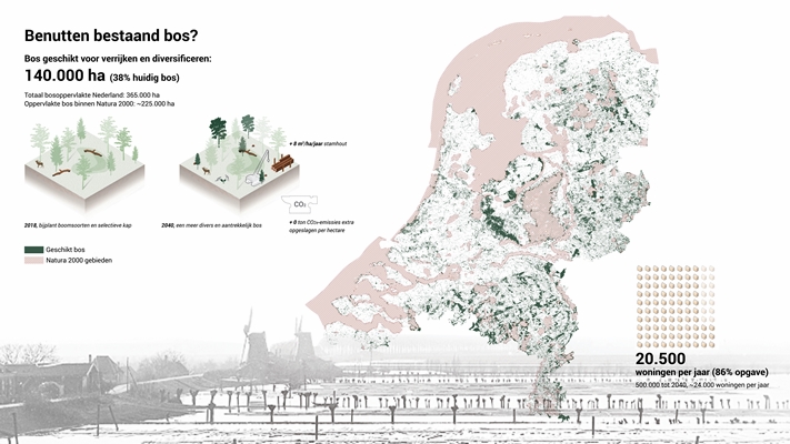 Het hout dat nodig is voor de Nederlandse bouwindustrie kunnen we volgens Vermeulen voor een ruim deel uit de huidige productiebossen. Als die duurzaam worden beheerd, ‘groeien’ er volgens de architect 60 woningen per dag in de Nederlandse bossen. Wil Nederland de bouw versnellen, dan moet er bos worden bijgeplant; in combinatie met diversificatie zouden we meer, betere en aantrekkelijkere bossen krijgen.