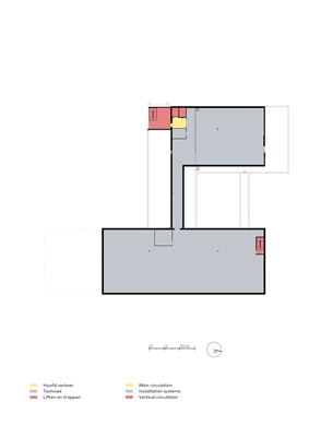 Vanuit het centrale ontvangstgebied op de begane grond is er naar alle zijden zicht op de omgeving. Zo ziet men bij binnenkomst meteen de 3.000 m