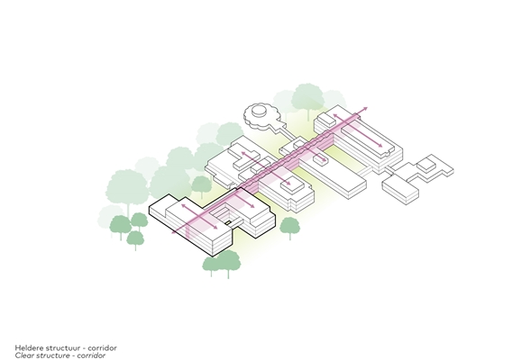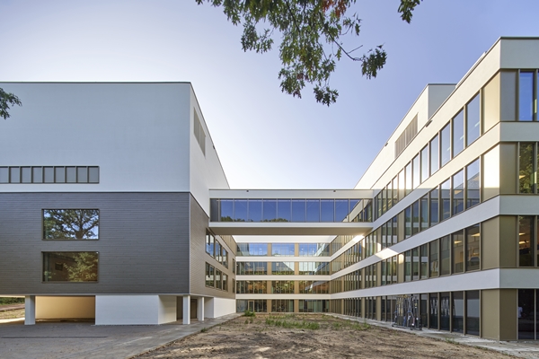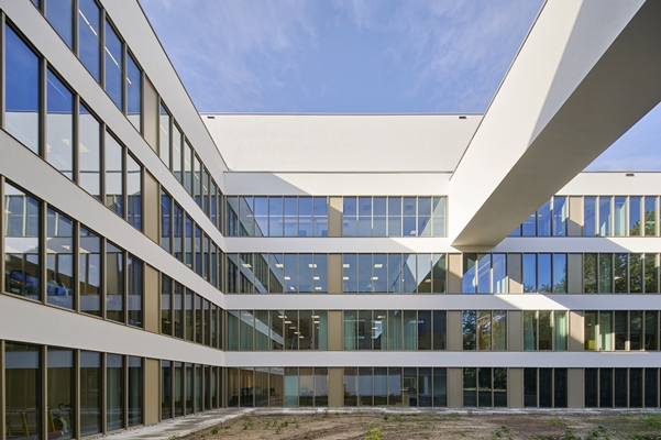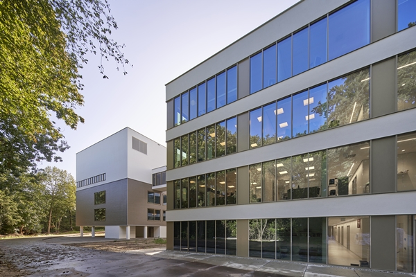 De nieuwbouw is verrezen aan het einde van de bestaande centrale as, in plaats van twee bouwdelen die zijn gesloopt. De uitbreiding zet de dubbele kamstructuur op vanzelfsprekende wijze voort met drie zijvleugels aan de verlengde hoofdas. De rechthoekige volumes zijn elk vier verdiepingen hoog.