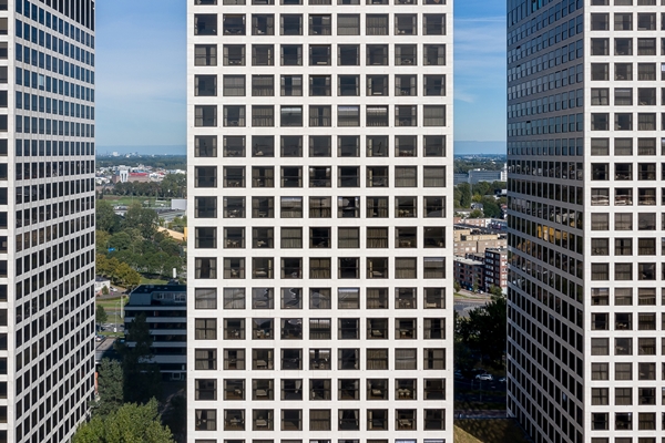 De kleur van het aluminium en het glas zijn exact gelijk aan de bestaande kozijnen in de derde toren, terwijl de nieuwe schuiframen alleen een andere vlakverdeling hebben. Het verschil tussen de woontorens en de kantoortoren is groot genoeg om de twee functies te herkennen en is klein genoeg om het complex nog altijd als een eenheid te zien, aldus het bureau.