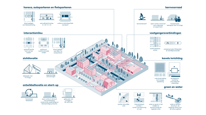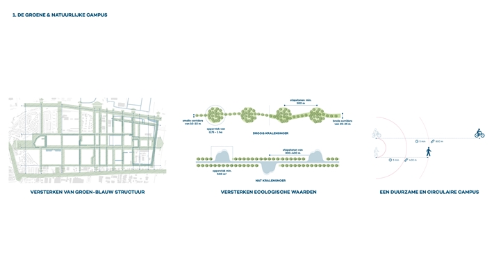 De campus moet uitnodigend zijn, om het onderling contact tussen studenten, onderzoekers en bedrijven te stimuleren. Er moet nagedacht worden over het gebruik van de openbare ruimte, inclusief de groene en blauwe structuren van het gebied.