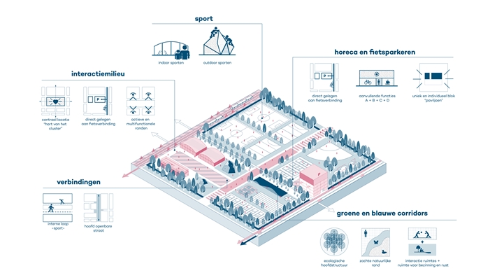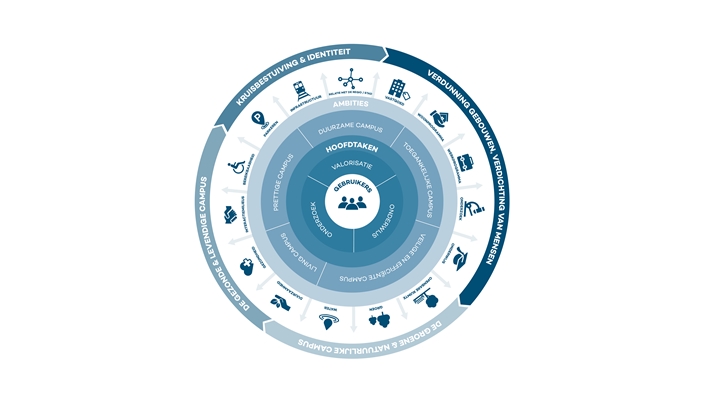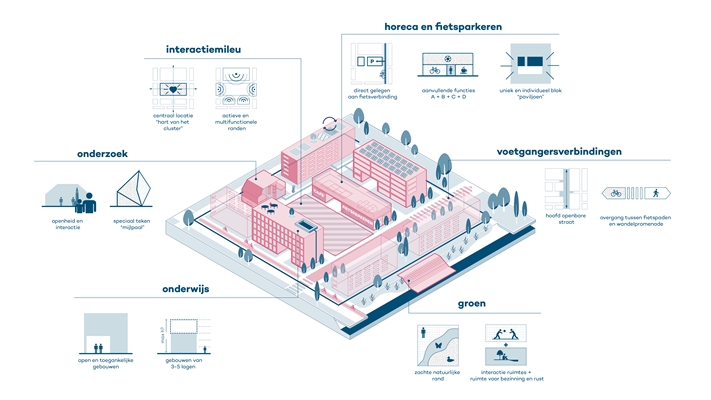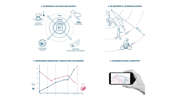 De verhaallijn ‘identiteit & kruisbestuiving’ tot slot betreft de ruimtelijke identiteit van de campus, met herkenbare clusters van gebouwen waar ontmoeting en kruisbestuiving plaatsvindt.