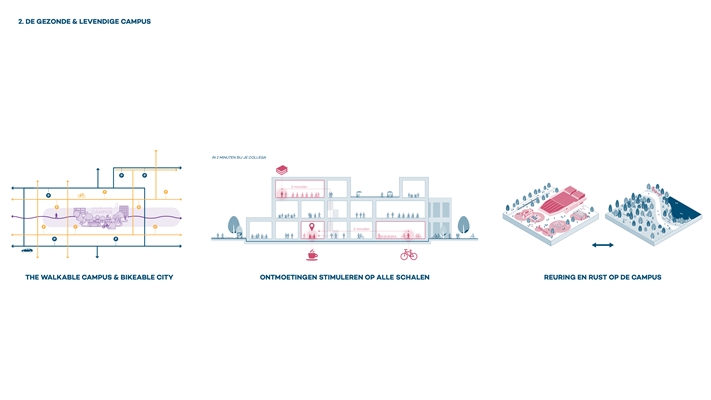 De tweede lijn betreft een ‘gezonde & levendige campus’, met aandacht voor onder andere ruimte voor wandelaars en fietsers, alsook het stimuleren van ontmoeting. Daarbij horen clusters van collectieve voorzieningen, plekken voor sport en cultuur, naast plekken van rust.