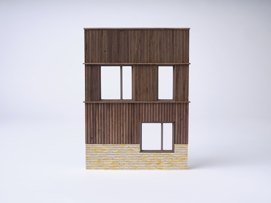 Een 1,4 meter hoge rondgaande plint van metselwerk verbindt de afzonderlijke woningen. Daarboven wordt de gevel verder opgetrokken is brede en smalle houten latten. De woningen bestaan alle uit een 1-laags basement met een individuele massa op de verdieping. Daarmee behoudt het architectenbureau het kleinschalige karakter.