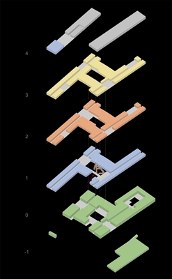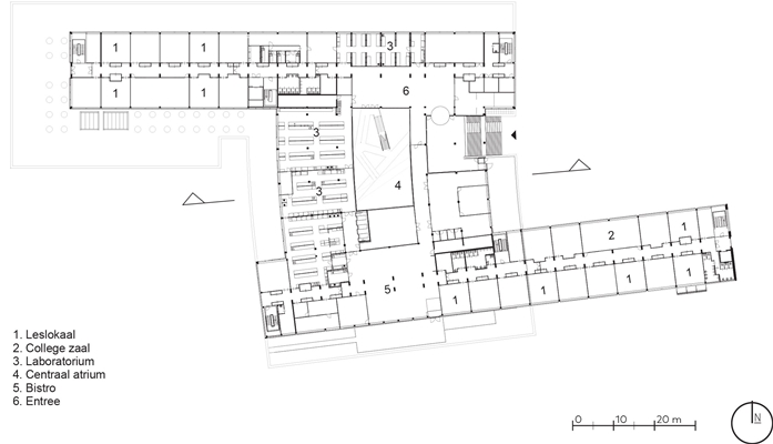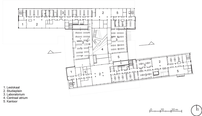 Met de verdeling van de opleidingen over de verdiepingen hebben de architecten de grote diversiteit aan onderwijsvormen kunnen faciliteren. De eerste verdieping fungeert daarbij als een gemeenschappelijke laag, die bovendien toekomstige wijzigingen in bijvoorbeeld de onderlinge verhoudingen tussen de instituten kan opvangen.
