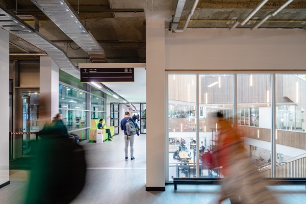 Het onderzoekgebouw oogde als een gesloten wereld, waarin 500 medewerkers hun plek hadden in de labs en kantoren, gelegen aan lange gangen. De opgave voor de drie architectenbureaus bestond erin het pand om te vormen tot een inspirerende, uitnodigende en toekomstbestendige leeromgeving voor 2.500 studenten.