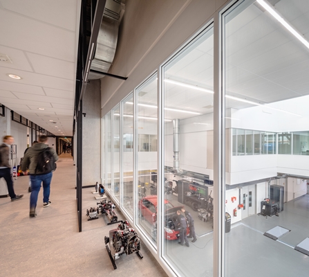 Het voormalige TNO-onderzoeksgebouw op de campus van de Technische Universiteit Eindhoven (TU/e) is getransformeerd tot een open en inspirerend onderwijsgebouw voor drie instituten van Fontys. Daartoe hebben
