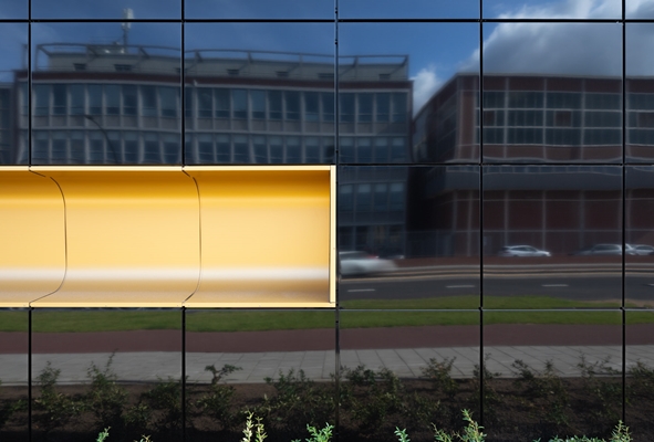 De deuren en poorten zijn niet direct zichtbaar doordat ze nauwkeurig zijn gedetailleerd binnen het gevelraster. De gevel is voorzien van een langgerekte, goudkleurige sleuf, die de expressie van het gebouw versterkt. Vooral als hij ’s avonds oplicht is dat het geval.