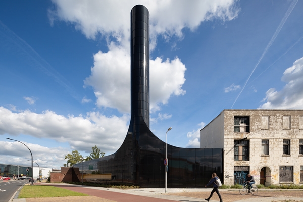 Een gebouw dat zo prominent is gesitueerd, mag een markante verschijning hebben. Joep Mollink en Daniël Peters hebben het gebouw een gestroomlijnde vorm en een opvallende schoorsteen op de hoek gegeven. Die markante vormgeving past ook bij de functie van het gebouw, leggen de architecten uit: het is een geavanceerde machine met warmteketels en –leidingen.