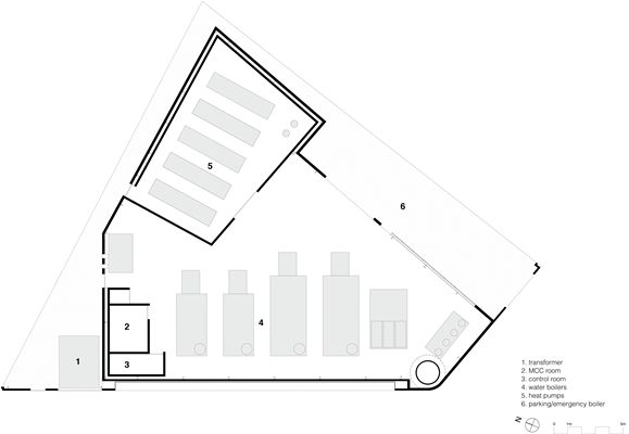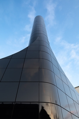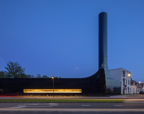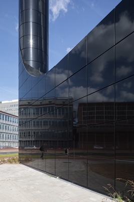 De gekromde zwart-metalen gevelbekleding refereert aan de grote stalen ketels en turbines die hier in de vroegere metaalfabrieken werden gemaakt. De uitwerking van het ontwerp vereiste een minutieuze afstemming met de complexe installatietechniek, de constructie en de gevelengineering, vertellen de architecten.