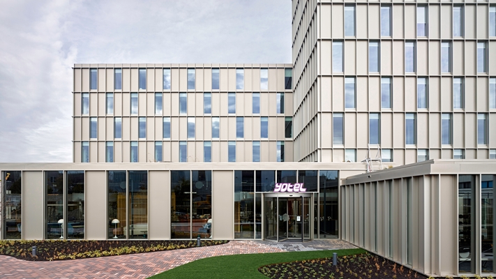 De gevel is bekleed met panelen van titaniumkleurig, gerecycled aluminium. De gevelpanelen zorgen voor een subtiel spel van licht en schaduw. Door de alzijdige toepassing van de aluminium panelen voegt het hotel zich in het industriële karakter van de omgeving.