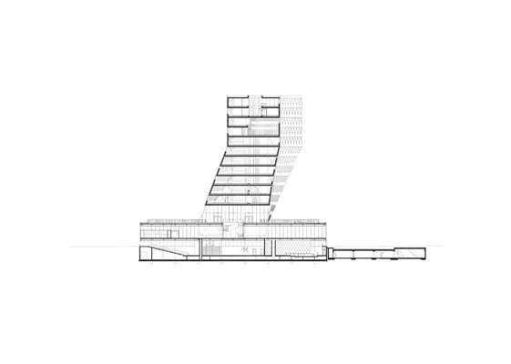 De voorbouw van de toren vormde een breed front dat het provincieterrein afsloot. Om dit te doorbreken heeft het architectenbureau daar een nieuwe bouwschijf haaks overheen gezet. Bovenop dit dwarsdeel is een kantoorvolume gerealiseerd, waarvan de verdiepingen uitwaaieren, legt XDGA uit.