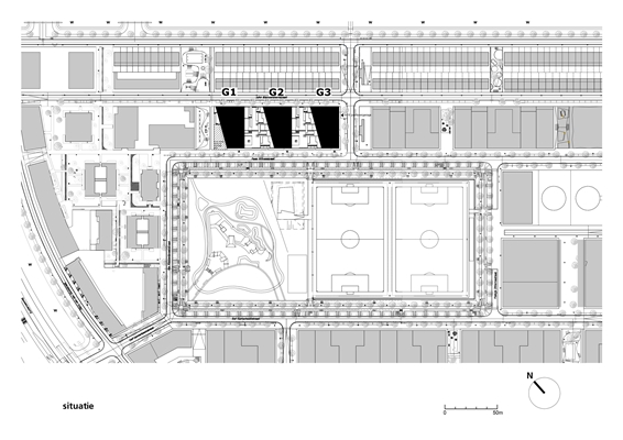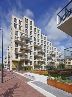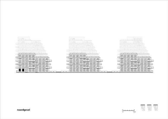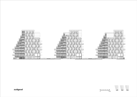 Zowel in massa als in plattegrond van het project heeft Arons en Gelauff Architecten gestreefd naar een goede oriëntatie op de zon. De gevels zijn aan de westelijke zijde schuin gezet. De aflopende doorsnede van de gebouwen zorgt voor bovendien voor een geleidelijke overgang naar de straat met gezinswoningen aan de noordoostelijke zijde, leggen de architecten uit.