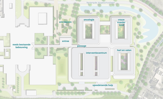 De nieuwe gebouwdelen zijn via loopbruggen met elkaar verbonden. Een centrale en met daglicht overgoten passage vormt de ruggengraat van het complex en verbindt de nieuwbouw met het bestaande ziekenhuis. Vanaf de passage zijn alle afdelingen en het restaurant goed zichtbaar, laat Wiegerinck weten. Onder de passage ligt een logistieke gang die het bestaande ziekenhuis met de nieuwbouw verbindt.