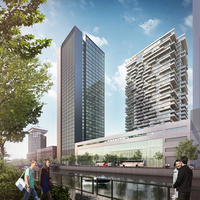 is gemaakt, bestaat uit een 110 meter hoge hoteltoren, een 101 meter hoge woontoren en een congrescentrum. Het hotel, geëxploiteerd door het Duitse Maritim, krijgt 579 kamers en wordt het hoogste gebouw van stadsdeel Noord.
