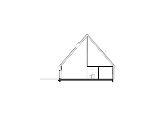 Het achterste volume met spits zadeldak is door zijn omvang zichtbaar vanaf de weg. Voor de multifunctionele ruimte die zich in dit volume bevindt, hebben de architecten bekende elementen uit de woonomgeving genomen en in een nieuwe onderlinge verhouding geplaatst.