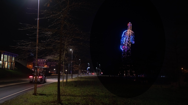 Voor een harmonieus en aangenaam beeld tegen de donkere omgeving hebben de kunstenaars gekozen voor warm wit licht. Vanwege de hoogte van de mast – 37 meter – en de halverwege veranderende richting van het vakwerk zijn de spots op twee niveaus geplaatst: vlak boven de voet en bij de knik in de romp.