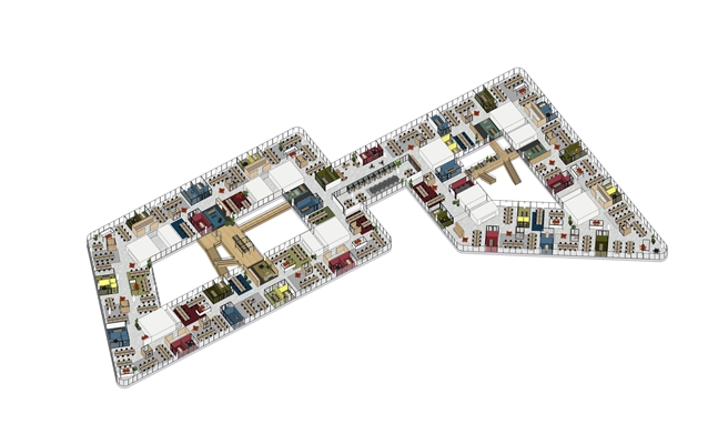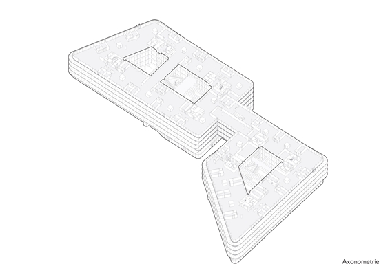 Beide volumes hebben in het hart een helder en overzichtelijk atrium, waardoor daglicht diep in het gebouw kan komen. HofmanDujardin ontwierp het volledige interieur, inclusief de zwevende platforms en de trappartijen die beide atria doorkruisen. De opvallende, houten platforms vormen een visuele en fysieke verbinding van plekken – en mensen – en brengen een levendige en vriendelijke sfeer in het gebouw. Tegelijkertijd symboliseren ze, aldus HofmanDujardin, de identiteit van een 21