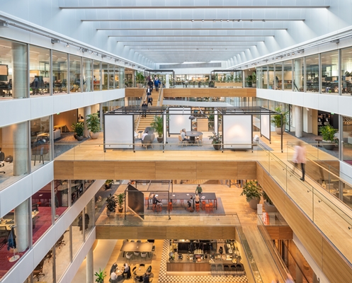 Vanaf de platforms zijn alle kantoorverdiepingen bereikbaar, via entreezones die elke hun eigen inrichting hebben. Door het hele gebouw is een eenduidig werkplekconcept toegepast, waarbij de architecten hebben gestreefd naar een goede balans tussen verschillende soorten ruimten. Er zijn ruimten met teamtafels, kleurrijke clusters van grote en kleine vergaderruimten en op elke verdieping een stilteruimte voor geconcentreerd werk, met een leestafel en privéplekken.