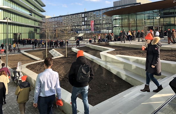 De landschapsarchitecten hebben de ruimte vormgegeven als een grote stedelijke tuin, ingericht met looproutes, verblijfspellen en zitgelegenheden. Groene terrassen met gebogen zitranden – een echo van de gebogen gevels die het ING-kantoor kenmerken – overbruggen op vanzelfsprekende wijze het hoogteverschil tussen het maaiveld en het verhoogde drevenniveau.