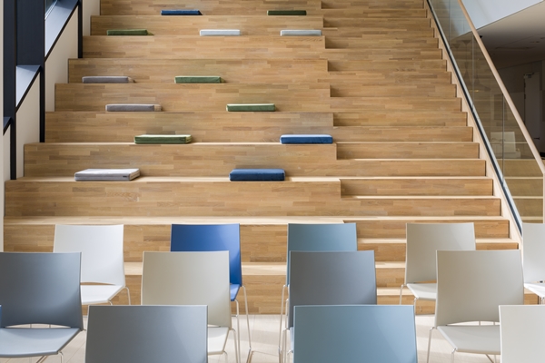 Via een eveneens houten tribunetrap staat de kantoorverdieping in verbinding met een ruimte waar presentaties en demonstraties worden gegeven. Deze ruimte loopt weer via een gang naast de trap over in het restaurant. Voor de medewerkers is op de tweede verdieping nog een dakterras gerealiseerd.