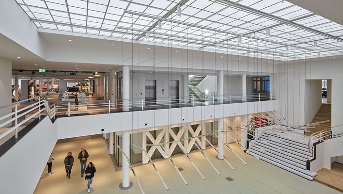 Centraal in het gebouw ligt een grote bijeenkomstenruimte onder een glazen overkapping. Op de begane grond zijn tevens de