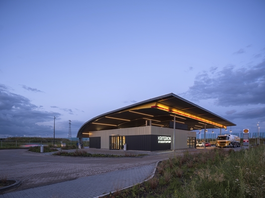 Tankstation met restaurant in luifel
