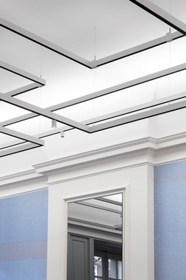 Als hedendaagse interpretatie van een kroonluchter hangen frames met verlichting aan het plafond. Daarbij verbinden de pendelarmaturen het restaurant met de receptie om Felix Meritis een grootse entree te geven.