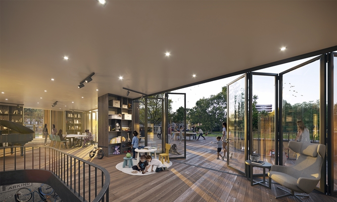 Aan de achterkant van het gebouw wordt op maaiveldniveau een collectieve ‘huiskamer’ gerealiseerd, waar plek is voor bijvoorbeeld buurtbijeenkomsten en huiswerkbegeleiding. De vloer van de huiskamer is gemaakt van hetzelfde hout als het terras dat grenst aan deze ruimte.