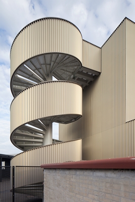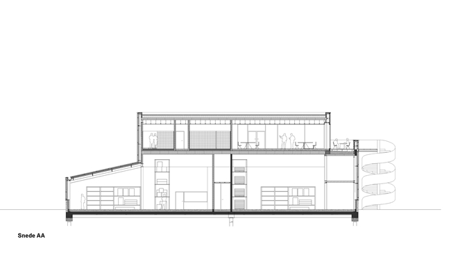 De plint van het gebouw heeft een aflopend dak, waardoor de kantoren in het volume op de verdieping een verbeterd zicht op het terrein hebben. Twee terrassen strekken op de eerste verdieping vanaf het kantoorvolume. Met de terrassen is een dubbele hoogte voor de ondergelegen magazijnen gecreƫerd, zodat hier grote goederen kunnen worden opgeslagen.