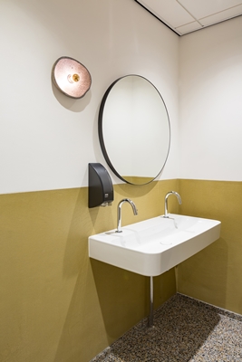 Eenzelfde houten getrapte zitplek verzacht een scherpe hoek in de flexwerkruimte, die, langs twee compacte concentratie- of overlegruimten, is verbonden met de bar-lounge. Verder is die ruimte ingericht met deels tweedehands kantoorstoelen en bureaus – waaronder oude ontwerpen van Leysner zelf. Het tapijt bestaat uit afgekeurde tegels (met weeffouten) en is een ontwerp van Studio Wae.