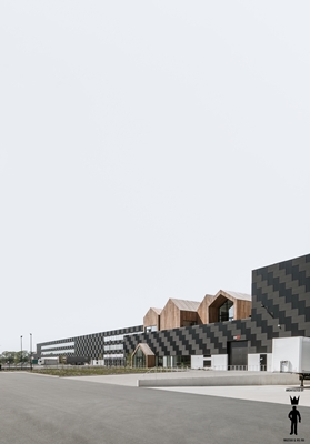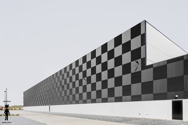 groot logistiek centrum voltooid. De gevel van het distributieverzamelgebouw is voorzien van een reliëf dat steeds van richting verandert. Bovenop het enorme complex, dat ontworpen is door de Belgische architectenbureaus