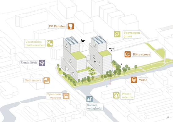 De toepassing van groene daken en voorzieningen zoals vogel- en vleermuiskasten dragen ook bij aan de versterking van de biodiversiteit ter plekke, vertelt het architectenbureau. Door een duurzaam energieconcept, met onder meer individuele warmte-koudeopslag en zonnepanelen, voldoet het gebouw volgens Rijnboutt ten minste aan de toekomstige BENG-eisen.
