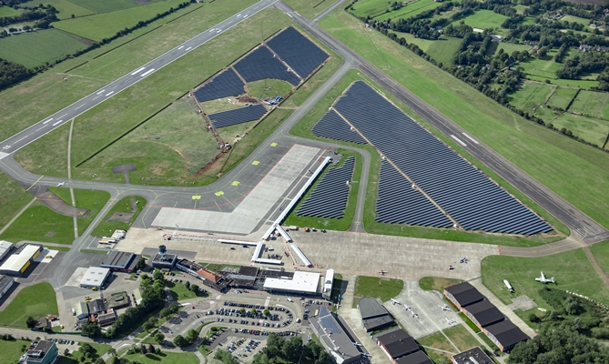 Zonnepanelen tussen start- en landingsbaan Groningen Airport