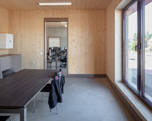 Het gebouw bestaat uit een hybride draagconstructie van beton en massief hout. De onderste laag met de garage en werkruimtes is omwille van de functionaliteit robuust afgewerkt in beton, terwijl de bovengelegen verdiepingen met kantoren en verblijfsruimtes zijn uitgevoerd in hout, dat moet bijdragen aan een huiselijke sfeer. De verschillende verdiepingen zijn verbonden via een centrale trap, die de brandweerlieden helpt snel uit te rukken bij een alarmoproep.