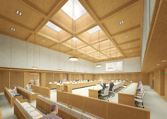 De raadszaal, die in de huidige situatie te krap bemeten was, verhuist van de begane grond naar een nieuw volume op de zolderverdieping. De nieuwe zaal biedt plek aan 45 raadsleden en een publieke tribune. Om het idee van de ‘raad op zolder’ kracht bij te zetten, wordt de zaal voor een groot deel in hout opgetrokken. Een deels transparant cassetteplafond voorziet de ruimte van daglicht.
