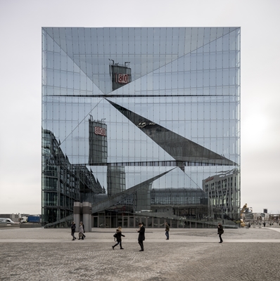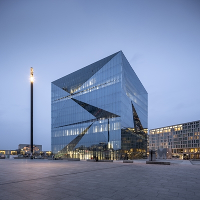 , maar dankzij de driehoekige vouwen in de gevels oogt cube berlin onregelmatig en sculpturaal. Het spiegelende glas versterkt dit effect en reflecteert de omgeving op speelse wijze.