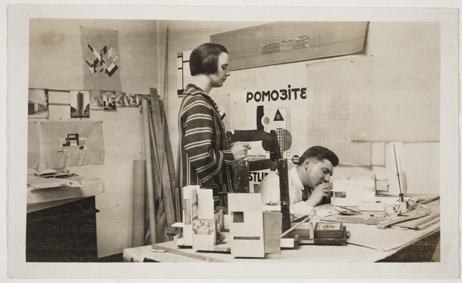 Nelly van Doesburg en Cornelis van Eesteren werken aan een maquette in de studio in de Rue du Moulin Vert, Paris, 1923