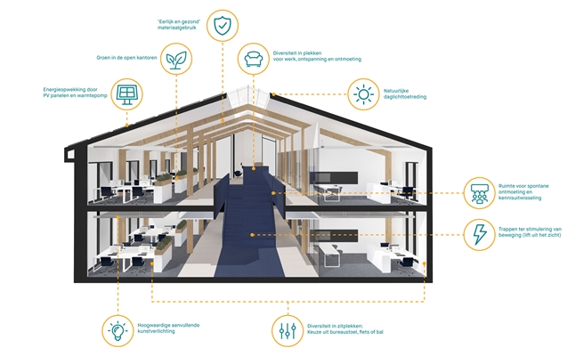 Voor het interieurontwerp stonden aspecten als een gezonde werkomgeving en het stimuleren van ontmoeting en interactie centraal, laten Wiegerinck en Studio id+ weten. Exterieur en interieur zijn bovendien integraal ontworpen, waardoor deze elkaar versterken.