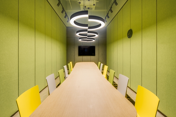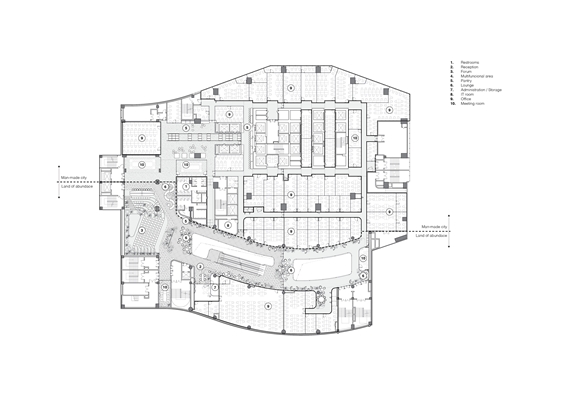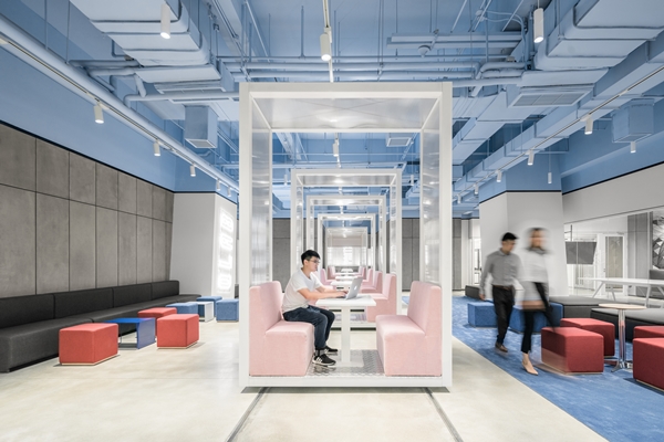 De centrale ruimte in deze zone is een groot en flexibel forumgebied. Voor de vormgeving heeft Superimpose zich specifiek laten inspireren door de Sichuan-vlakten, legt het bureau uit. Hier kenmerkt het ontwerp zich door vloeiende lijnen, afgeschuinde hoeken en 'zachte' meubels. Planten en bamboe vormen een groene achtergrond voor de werkplekken.