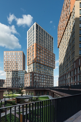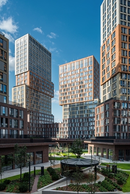 “Baksteen wordt tegenwoordig geassocieerd met kwaliteit omdat het zich onderscheidt van het beton en stucwerk dat voorheen overheerste in de Russische woningbouw”, vertelt de Architekten Cie.. “We ontwikkelden vijf standaardgevelontwerpen, waarbij een mix van baksteensorteringen en -kleuren veel variatie oplevert zonder dat het ten koste gaat van de eenheid van het ensemble.”