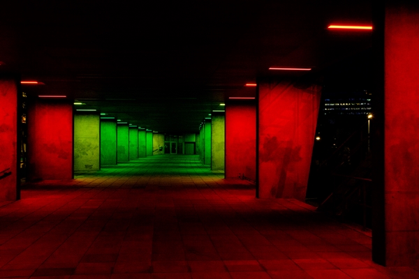 Onderdoorgang van het architectuurarchief van Het Nieuwe Instituut, met verlichting ontworpen door kunstenaar Peter Struycken