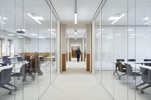De historische kenmerken heeft LIAG zelfs versterkt door het gebruik van neutrale materialen en kleuren voor nieuw toegevoegde elementen, aldus het bureau. Ruimten hebben namen gekregen volgens het NAVO-alfabet; dat refereert aan de historische context en drukt het internationale karakter van Universiteit Maastricht uit, legt LIAG uit.