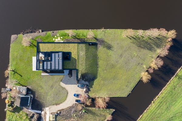 De villa staat op een eigen (!) eiland in De Kwakel en met dit eenvoudige concept keert het zich af van de woonwijk ten noorden van de woning, en opent het zich juist richting het water en het vrije uitzicht daarover op het zuiden.