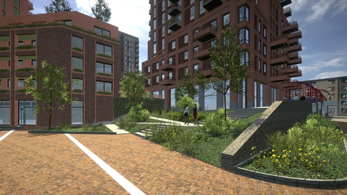 “De gemeente heeft een hoge ambitie op het gebied van circulair, natuurinclusief en klimaatadaptief bouwen”, vertellen de architecten. “Dat zie je terug in de uitwerking van de publieke ruimte, de private daktuinen en innovatieve wateroplossingen. De groene daken zorgen voor waterbuffering en er liggen bovendien kansen voor bouwen met een houten draagconstructie.”