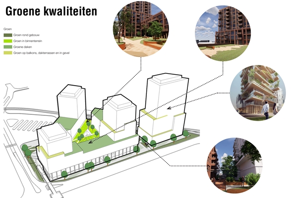 Ondanks het bouwen met een hoge dichtheid voegt het gebouw door de groene gevels en daken, de binnentuin en groen op het maaiveld wel 75% meer groen toe in het gebied, volgens de architecten.
