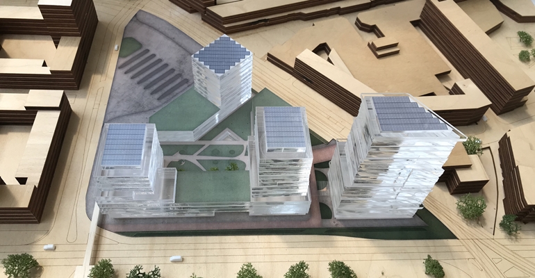 Op deze locatie komt een (nagenoeg) gesloten bouwblok rond een binnenruimte en een vrijstaande toren als herkenningspunt. Een krachtige plint van 4,5 meter hoog verbindt de blokken met elkaar en waarborgt de aansluiting met het maaiveld.