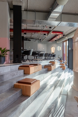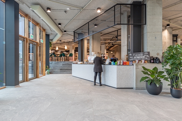 Via een aantal betonnen treden, die deels ook als zitmogelijkheid zijn ingericht, bereiken bezoekers en gebruikers van het gebouw de ‘food court’. Hier vinden ze meubels met eten en drinken; maaltijden worden bereid in het restaurant dat achter de food court ligt.
